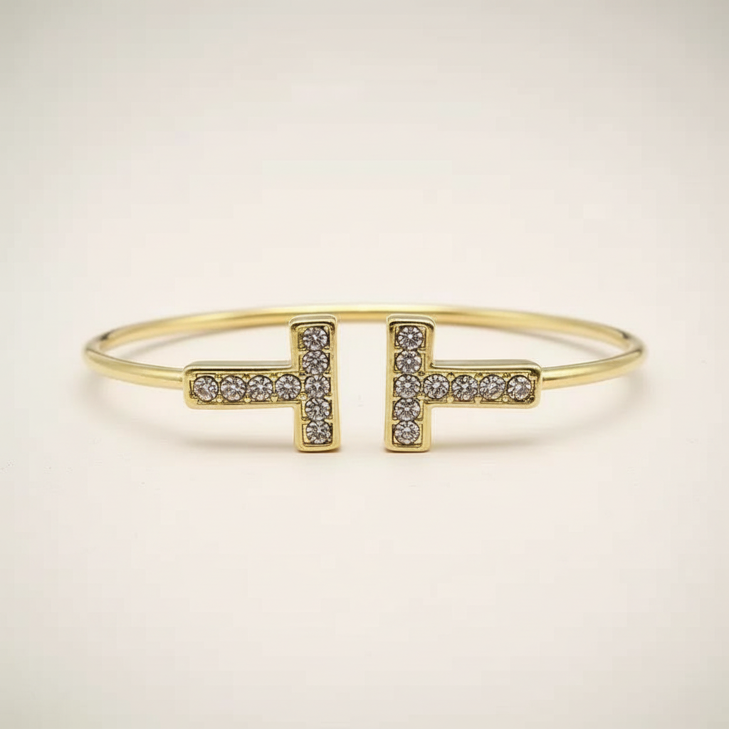 A bold yet refined cuff featuring a clean T bar design with subtle crystal detailing. Designed to elevate your everyday stack or stand alone as a statement piece.